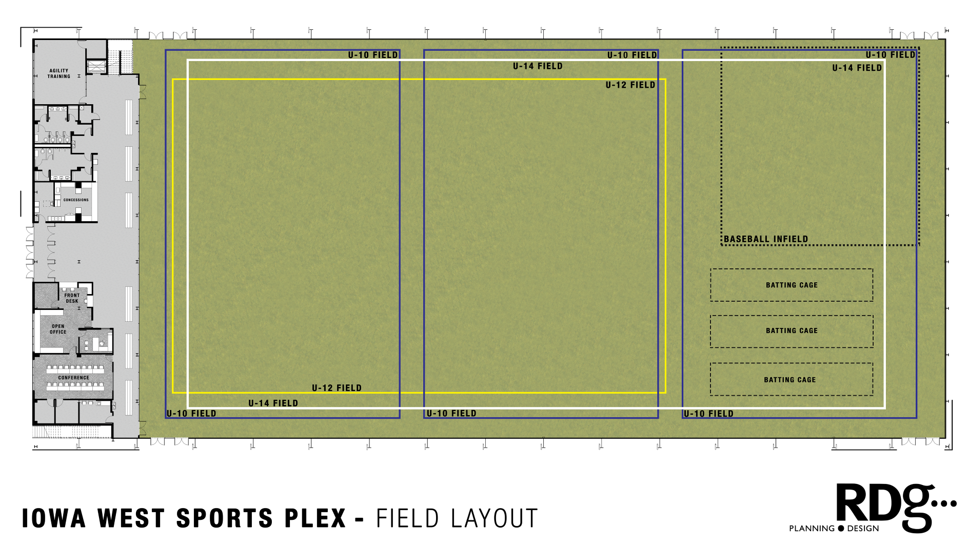 The Iowa West SportsPlex turf field can be rented in a variety of configurations to suit your group size and activity — from a single 1/3 field for small practices to the full pitch for tournaments and large events.